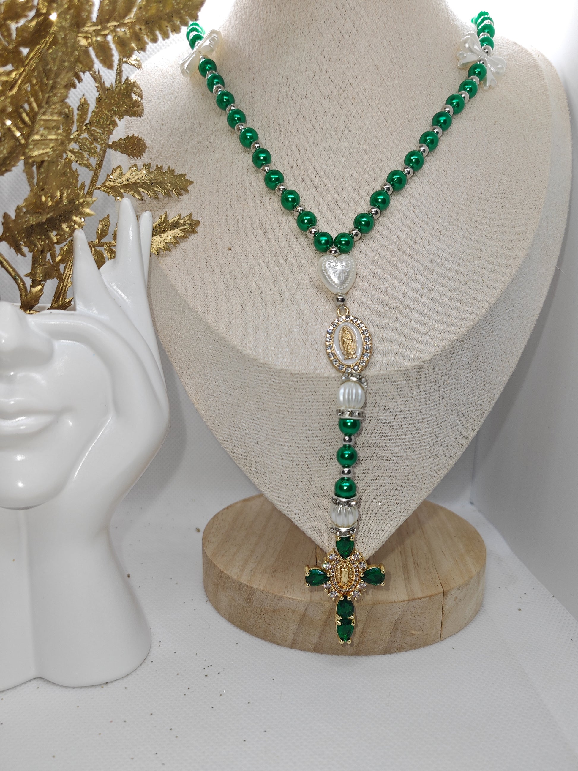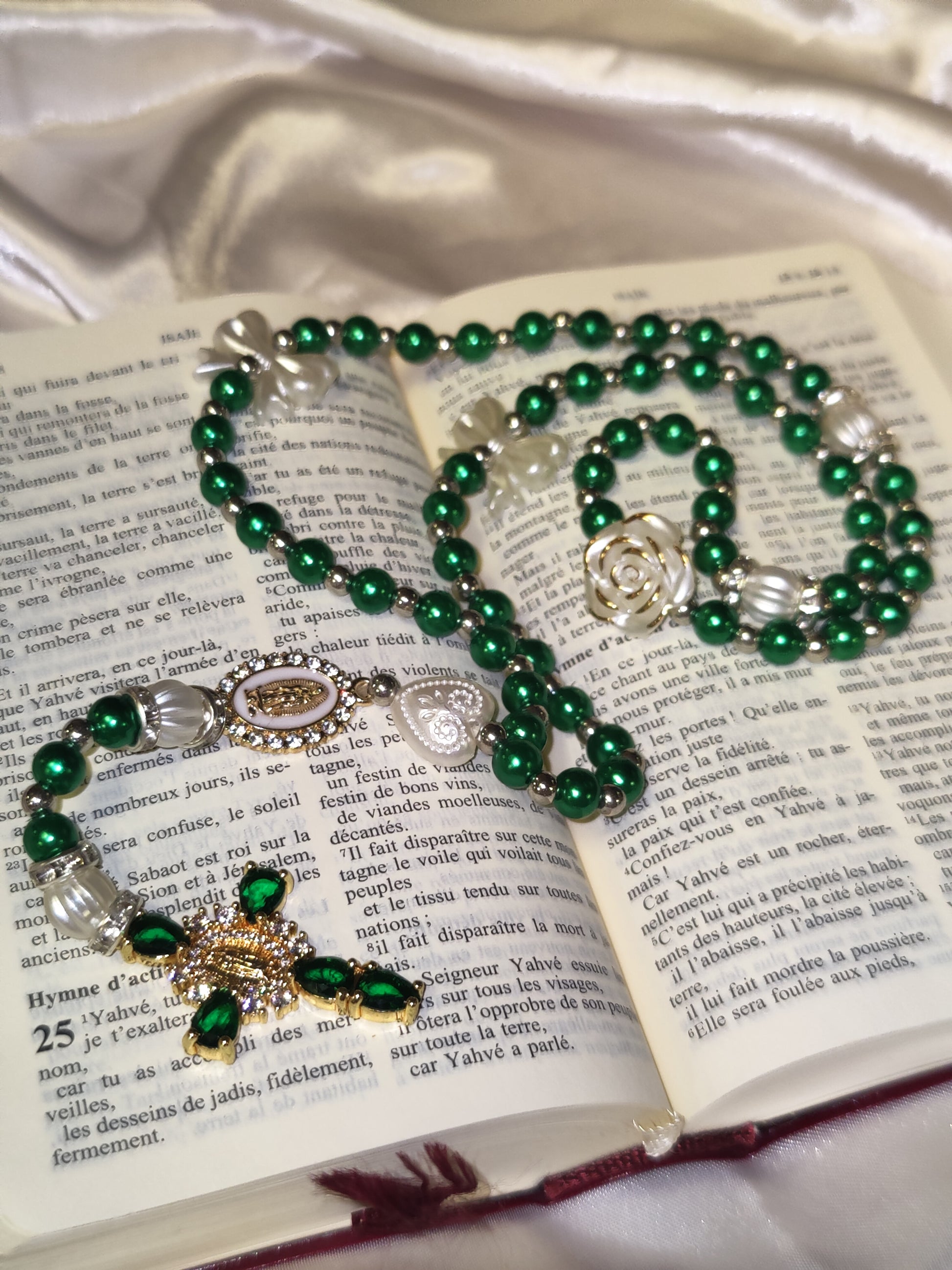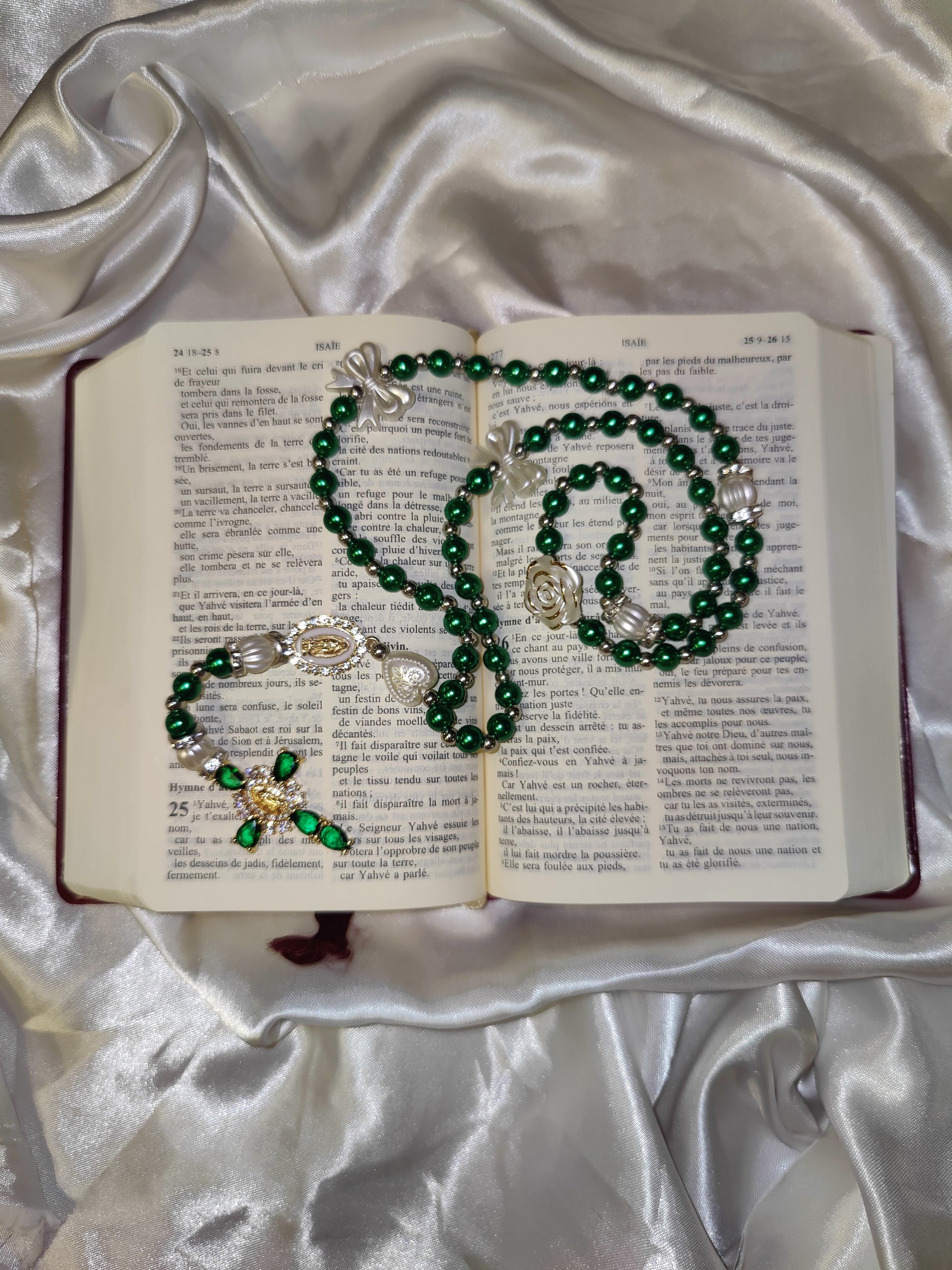Le chapelet Émeraude est une véritable célébration de la vie, de l'espoir et de la sérénité divine. Sa teinte verte profonde et lumineuse, rappelant la vitalité de la nature et la richesse de la pierre précieuse, lui confère une aura d'une beauté apaisante et revitalisante. Fait à la main avec une attention exquise aux détails, ce chapelet unique invite à la méditation et à une prière enracinée, offrant un moment de calme, de renouveau spirituel et de connexion profonde avec la création divine.