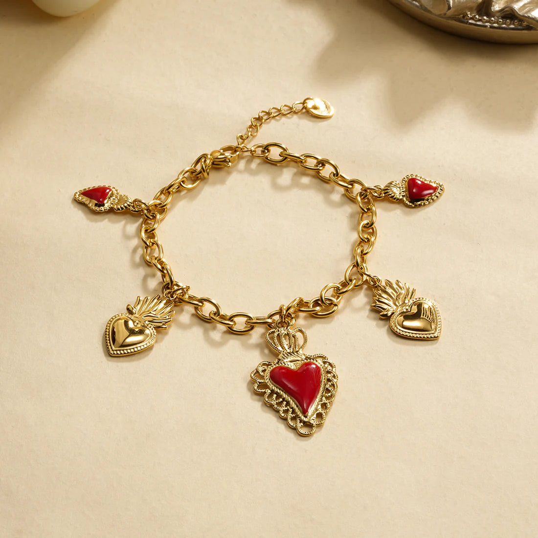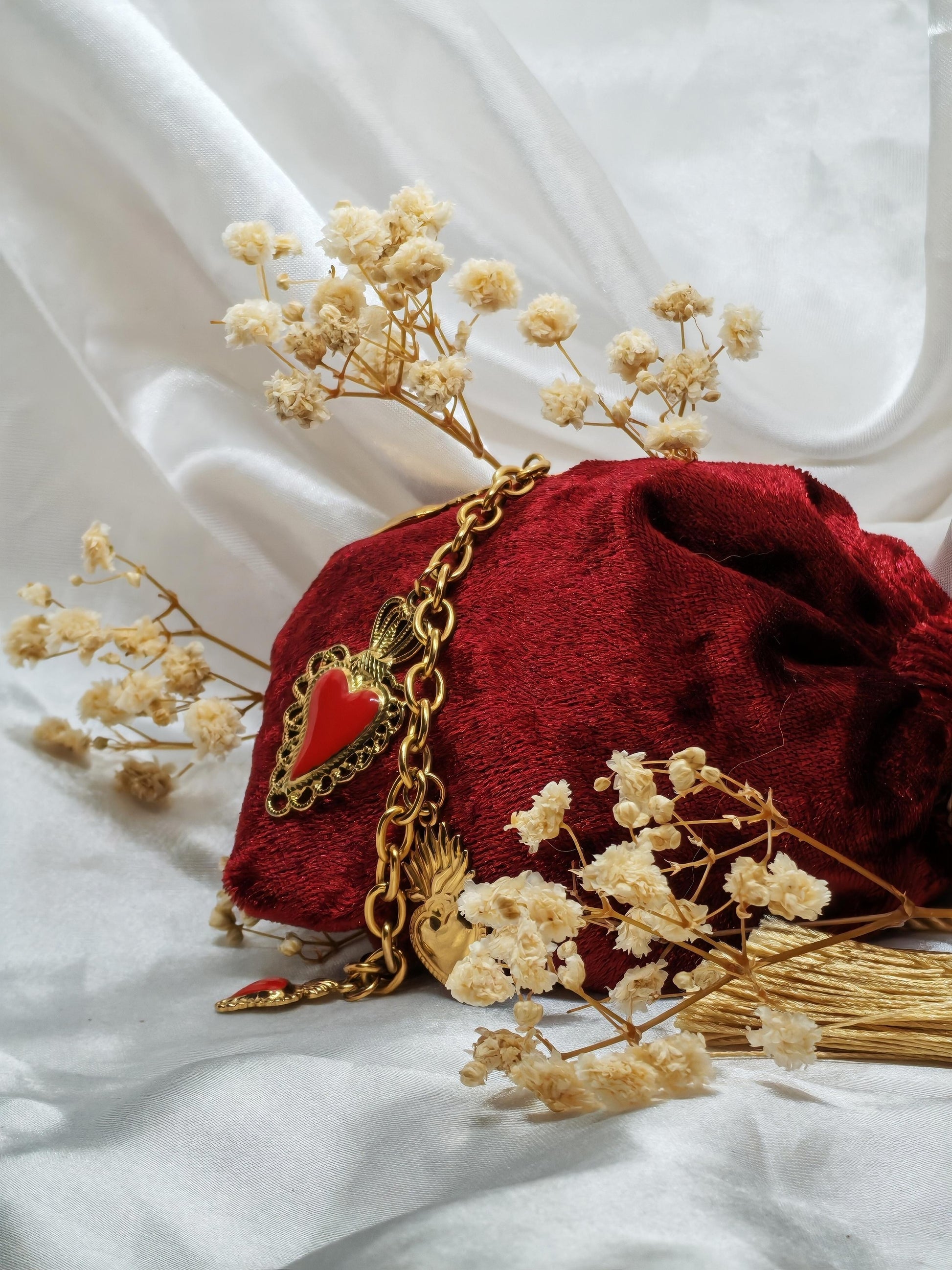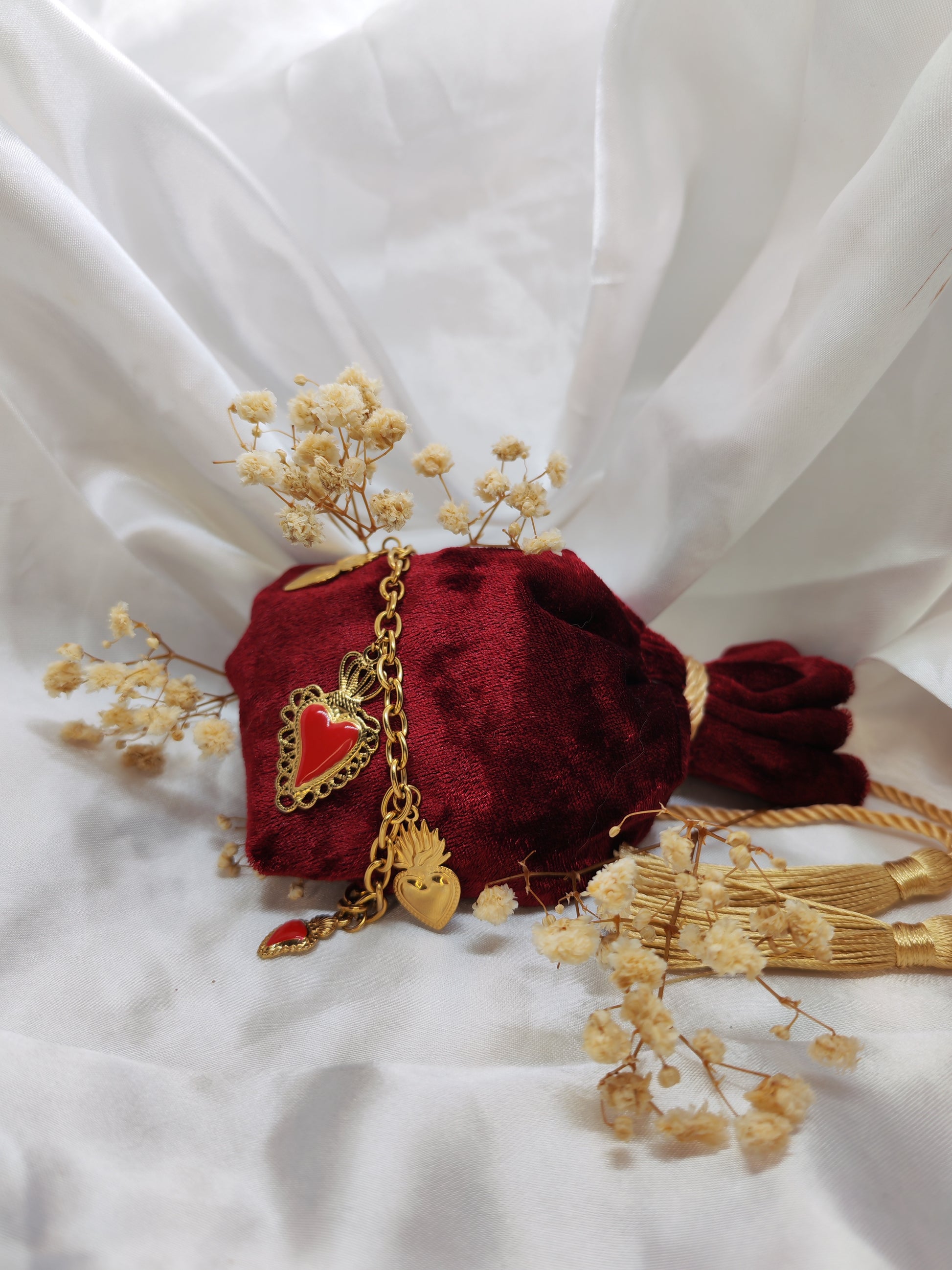 Inspiré par la pureté et la lumière de l’amour divin, le bracelet MARIA est un bijou empreint de grâce et de spiritualité. Ses breloques en forme de cœur, subtilement façonnées pour évoquer le symbole du Sacré-Cœur du Christ, rappellent la puissance de la foi et de l’amour inconditionnel. À la fois discret et intemporel, ce bracelet est parfait pour illuminer votre quotidien.
