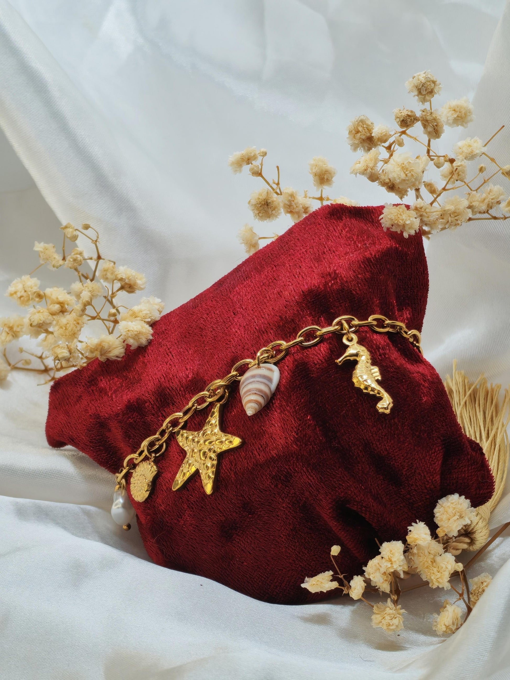Inspiré par la beauté et la sérénité de l'océan, le bracelet MOISE est un bijou qui incarne la chance, la protection et les miracles. Ses breloques en forme de coquillage, subtilement façonnées pour évoquer le symbole de porte-bonheur, rappellent la tranquillité et la richesse des eaux marines. À la fois raffiné et intemporel, ce bracelet est parfait pour illuminer votre quotidien et s'assortir élégamment au collier NAIA.