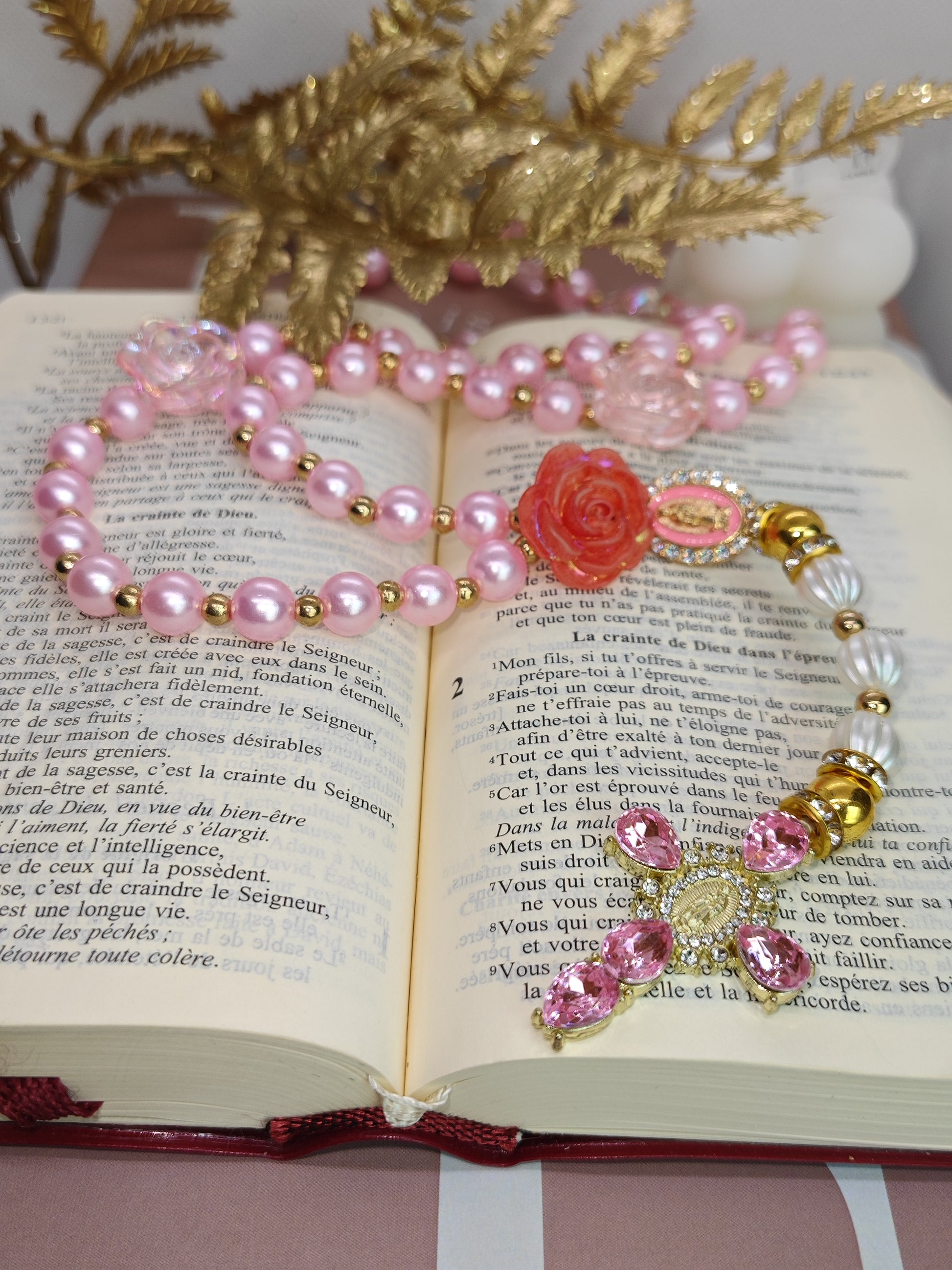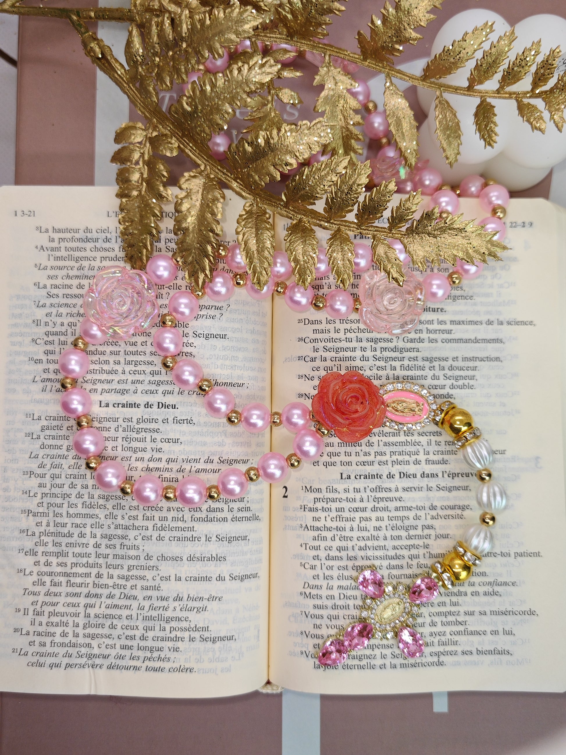 Le chapelet Pétale de Prière est une véritable ode à la douceur et à la spiritualité. Sa teinte rose délicate lui confère une aura apaisante, symbole d’amour, de compassion et de sérénité. Fait à la main avec un souci du détail exceptionnel, ce chapelet unique invite à la méditation et à la prière, offrant un moment de calme et de connexion profonde.