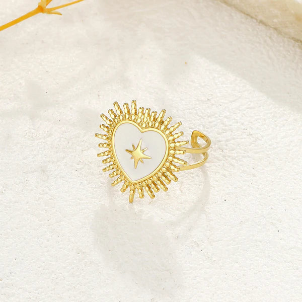Inspirée par la pureté et la lumière de l'amour divin, la bague Sacré-Cœur est un bijou empreint de grâce et de spiritualité. Sa forme en cœur doré, ornée d'une étoile en son centre, évoque le symbole du Sacré-Cœur du Christ, rappelant la puissance de la foi et de l'amour inconditionnel. À la fois discrète et intemporelle, cette bague est parfaite pour illuminer votre quotidien.